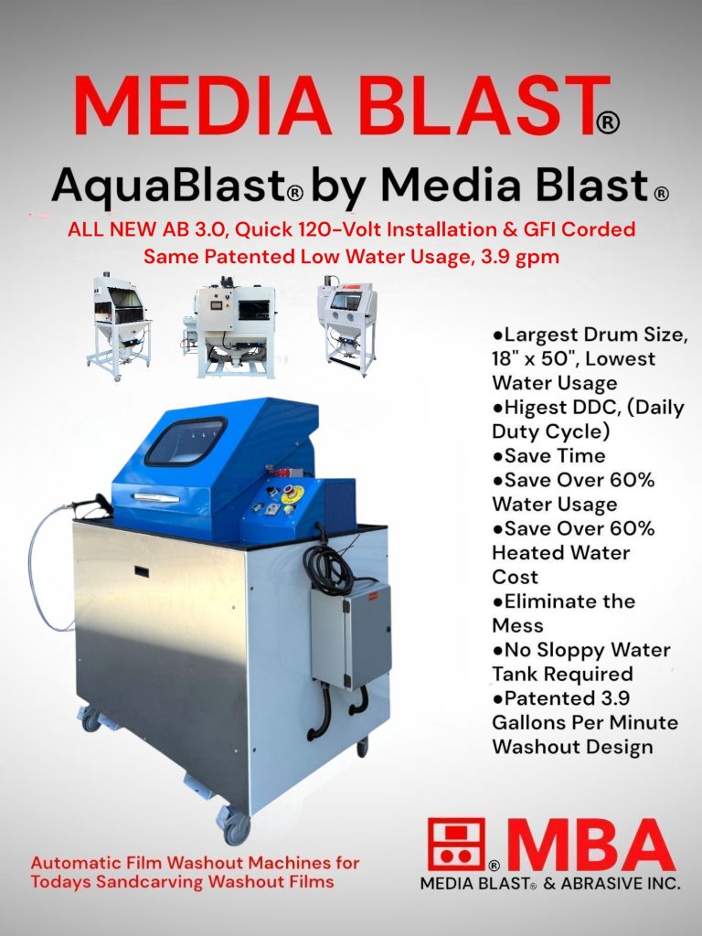 Media Blast & Abrasives is proud to introduce the new, 3rd Generation, AquaBlast® Elite 3.0 Film Washout Machines. This machine can solve many automatic film washout problems. It’s a great choice if you are ready to replace an older, high-water-flow automatic film washout model, or you are ready to buy a machine with advanced features. The new Elite 3.0 uses 60% less water, and, if the water is heated, you save twice saving half the heating cost. This can greatly reduce your washout expenses. The AquaBlast® Elite 3.0 can also reduce your labor costs using its Patented Enclosed High Pressure Washout Design.